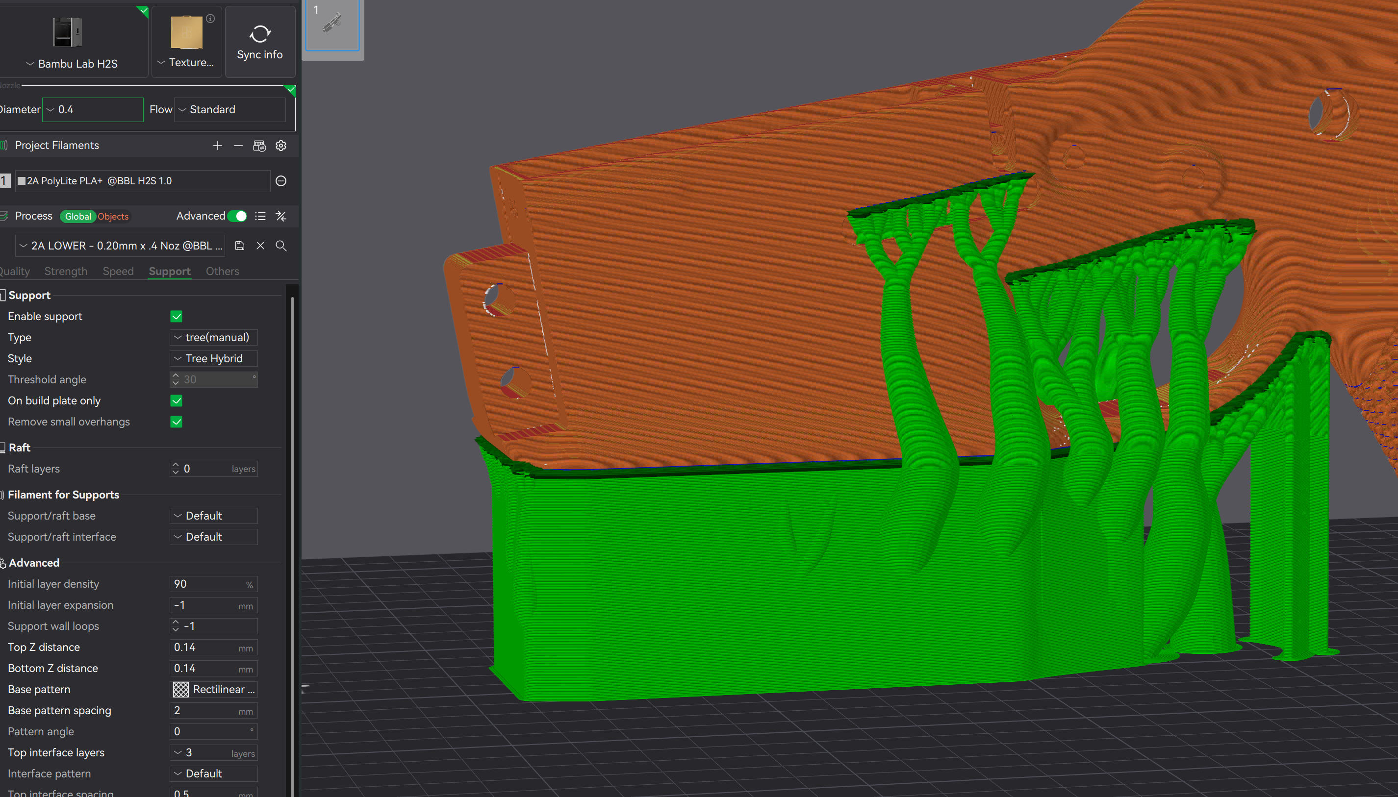 My first attempt was .1 for both rather than .2. This made the supports kind of hard to get off (although I will say it did make a decent underhang quality compared to normal settings). Took about 15 minutes to clean up with a screwdriver, rubber mallet, and a bit of xacto work and then a quick 5-10 seconds with a sanding block to make it feel better. My second successful print was at .12. This one took only a couple minutes to clean up, same tools, and barely any plucking with the xacto. In my mind this one is perfectly acceptable as I cleaned this one up in like 4 minutes, that's perfectly fine in my mind compared to 7 failed attempts at this model so far lol